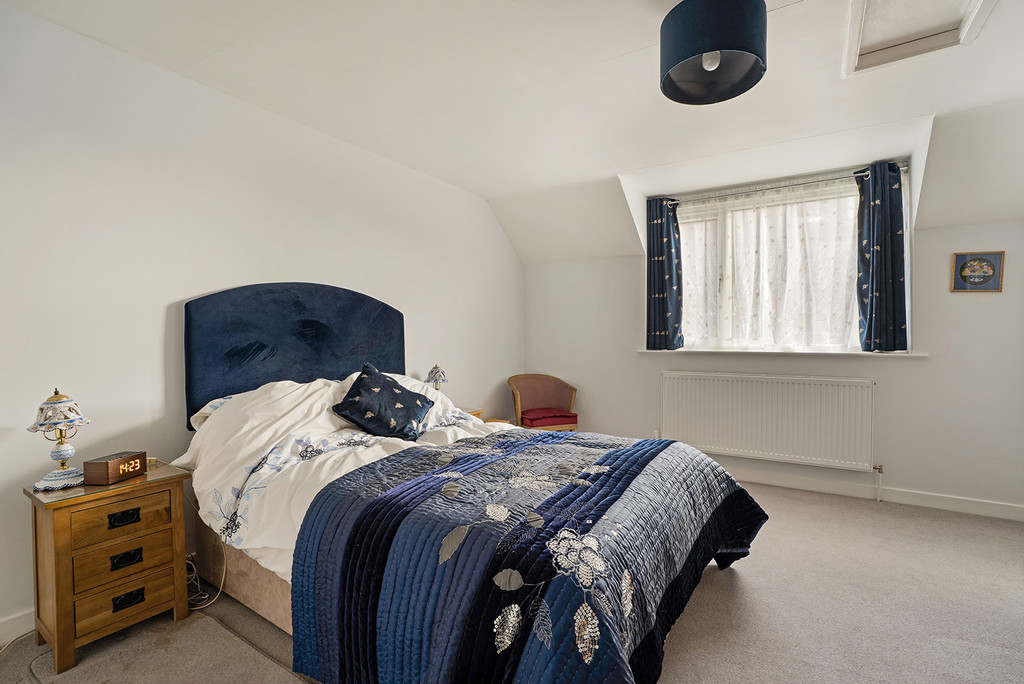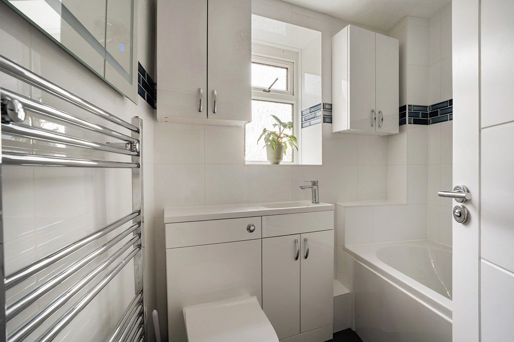 Bedroom One a spacious, bright room with access to loft, built-in storage cupboard. Bedroom Two outlook to the front of the property, built-in storage cupboard with wall-mounted Worcester combination boiler and desk unit to side. Bathroom with white suite comprising; vanity unit with WC and wash hand basin, panelled P-shaped bath with shower over. Tiled walls, towel radiator and obscured glazed window.