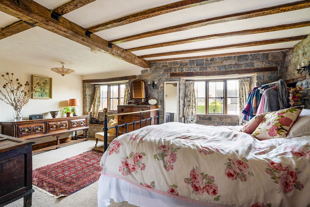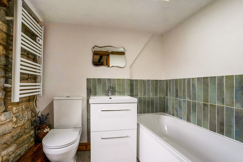 Landing with window to front, exposed beams and stonework. Bedroom One a large room with two windows to the rear of the property, exposed beams and stonework. Bathroom fitted with matching suite comprising panelled bath with mixer tap, wash basin set to unit with storage, close coupled WC, obscured glazed window, towel radiator, exposed stonework and beams.