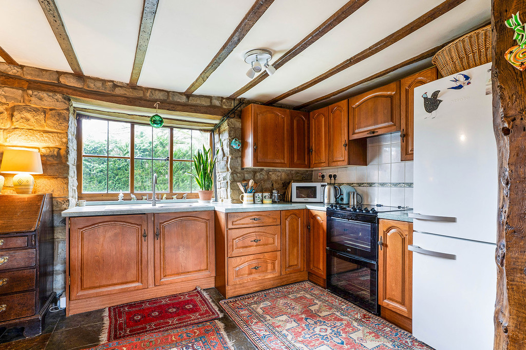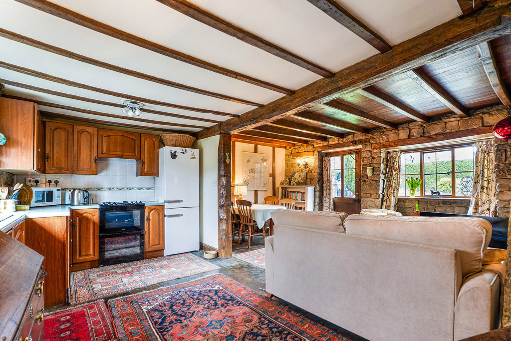 Kitchen/Living Room with under stairs storage, range of kitchen units to two walls including inset single bowl single drainer sink with mixer tap, integrated washing machine, electric cooker, space for fridge freezer. Matching wall cupboards, slate floor, exposed stonework and beams throughout. inglenook fireplace with multi fuel stove and double aspect to front and rear of the property with part-glazed door opening to garden.