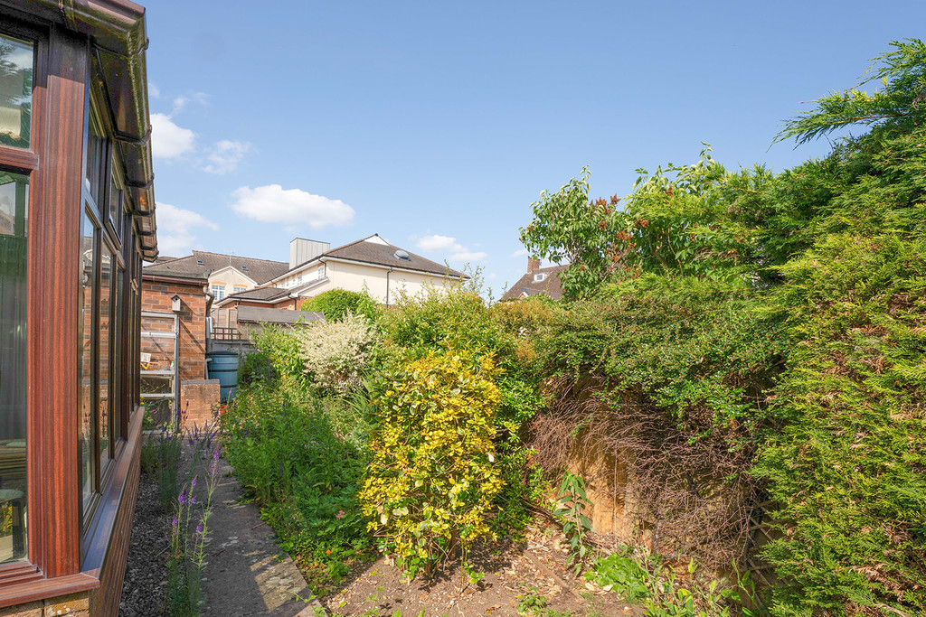 To the rear of the property an enclosed East facing garden has mature shrubs, plants and bushes with a paved pathway leading to an area of lawn and timber shed. Pedestrian gate returns to the front of the property. Outside lighting.