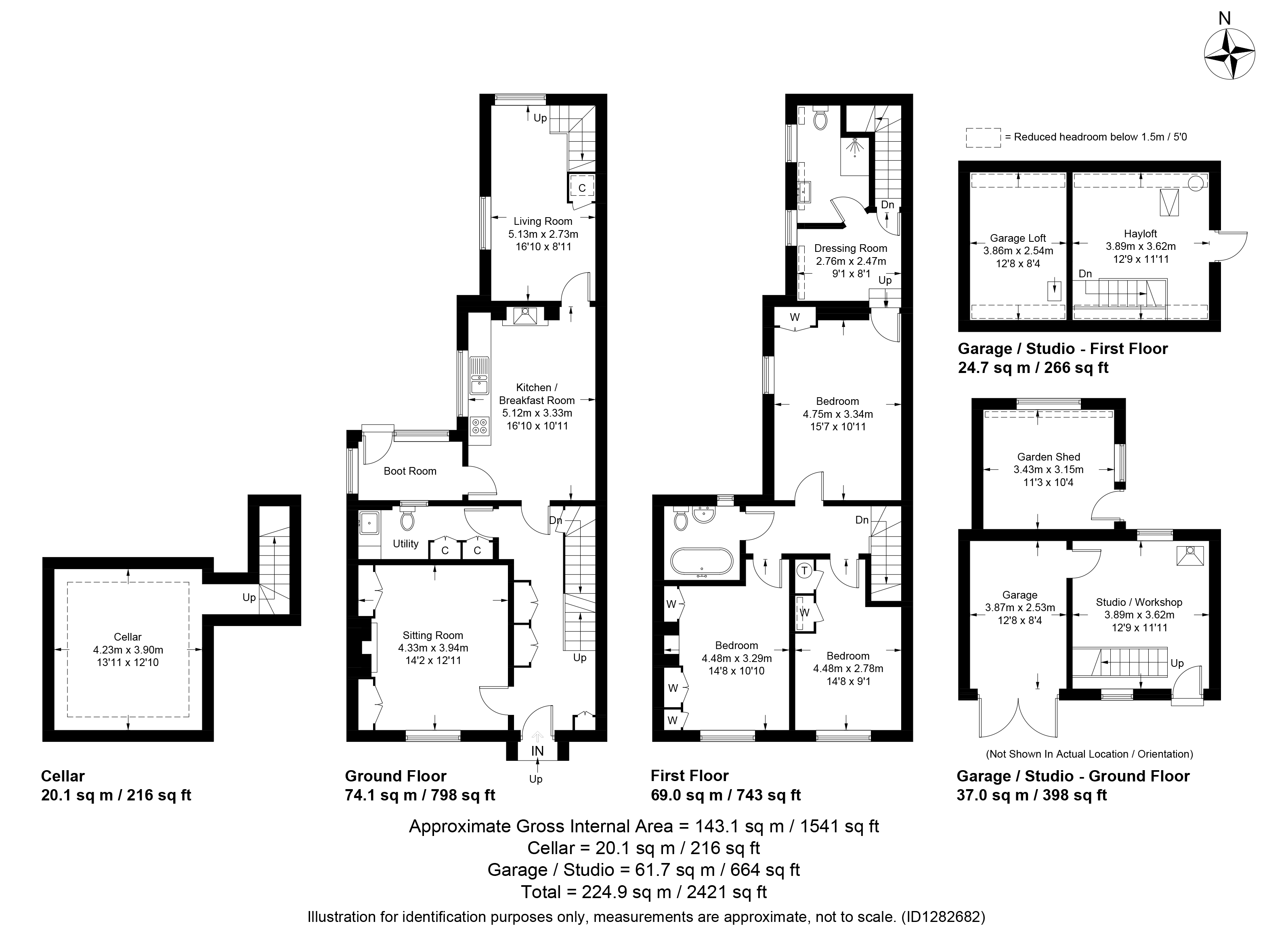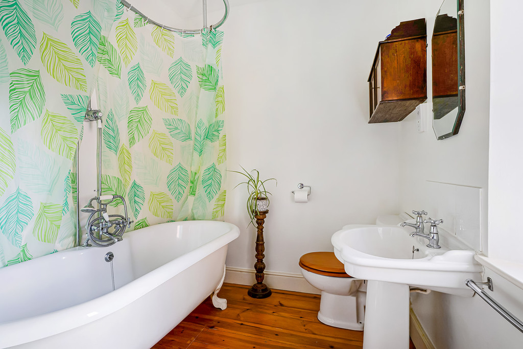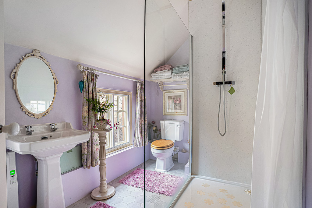 Landing with access to loft space. Bedroom One outlook to the rear of the property and built-in floor to ceiling wardrobe cupboard. Dressing Room with window to side and access to loft space. Staircase returning to living room. Ensuite Shower Room ftted with a large walk-in shower with dual showerhead, close coupled WC, pedestal wash hand basin and outlook to the rear of the property. Bedroom Two outlook to the front of the property and range of built-in floor to ceiling wardrobe cupboards. Bedroom Three outlook to the front of the property, built-in wardrobe cupboard and airing cupboard with hot water cylinder and storage cupboards over. Bathroom with double ended ball-and-claw bath with central mixer tap and separate shower unit over, close coupled WC, pedestal wash hand basin, obscured glazed window and exposed pine floor.