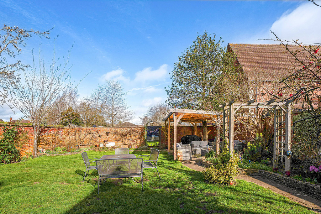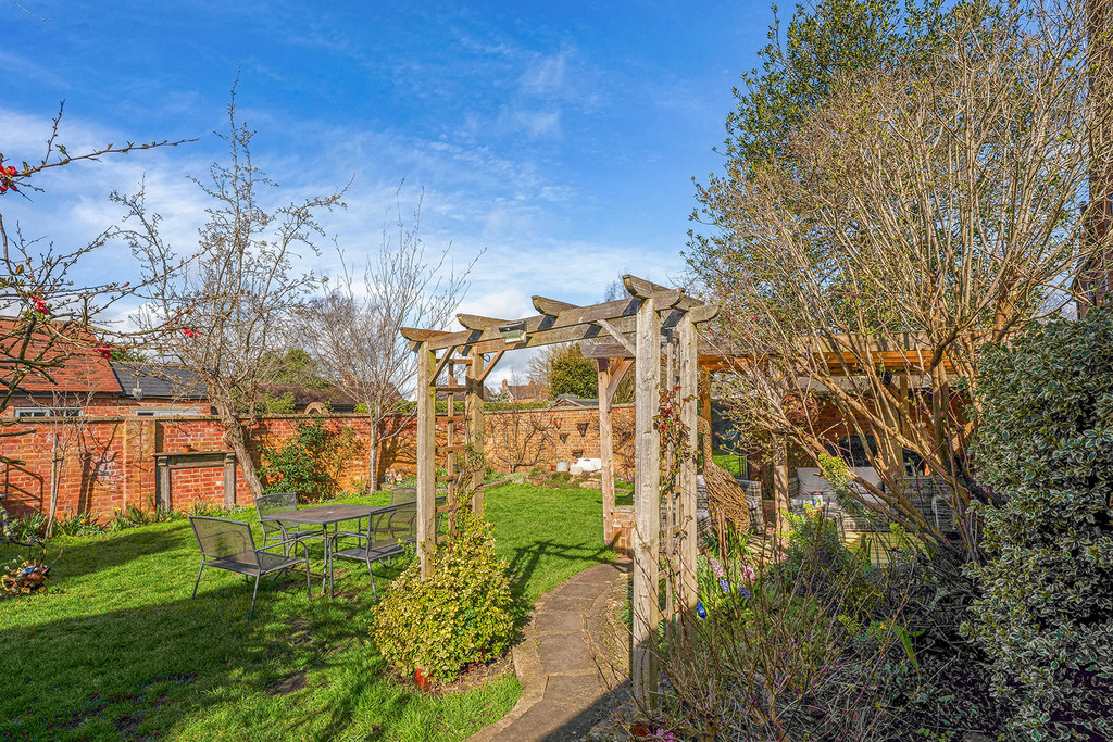 Brick archway with pedestrian gate leads to rear garden. Attractively landscaped with raised flower beds, mature trees, covered seating area and enclosed with a brick wall to three sides. Garden Shed with windows to two sides and door to front. Outside lighting.