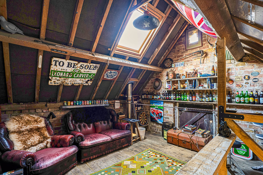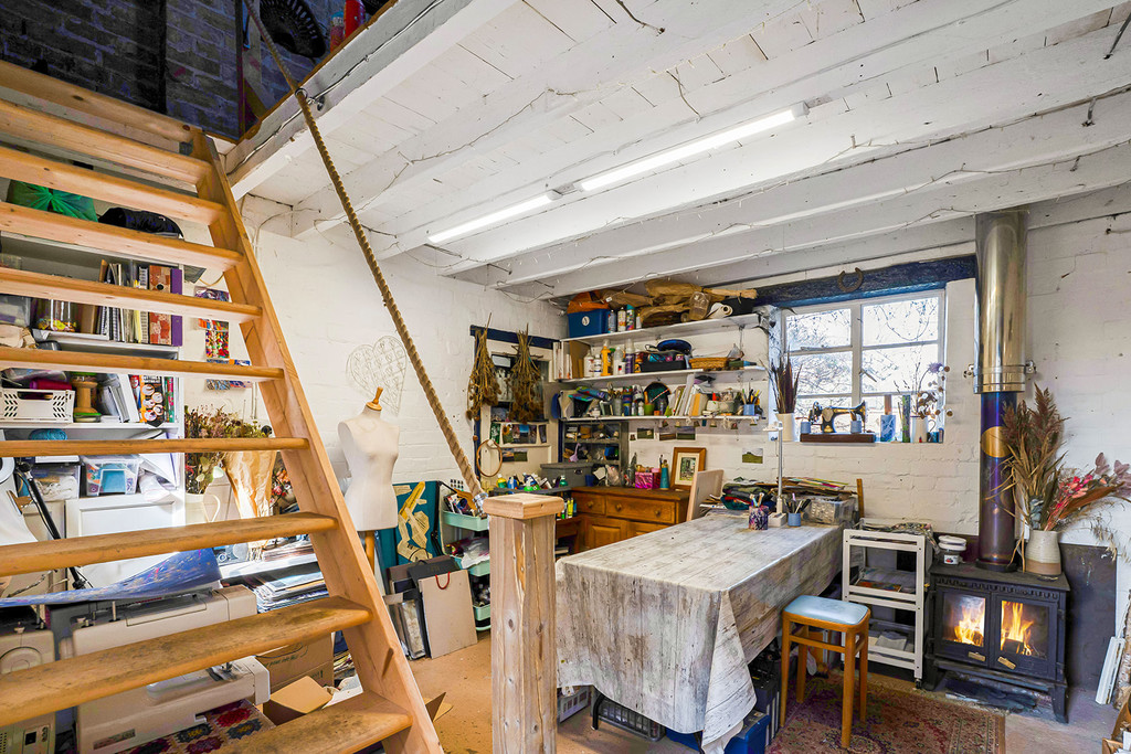 Outside, a private gated driveway leads to a detached two storey outbuilding currently arranged to provide a single garage, studio and two loft storage rooms over. Together with an adjoining garden store, this building offers potential for additional accommodation, subject to planning permission.