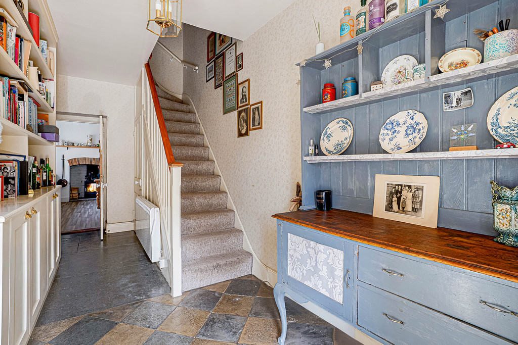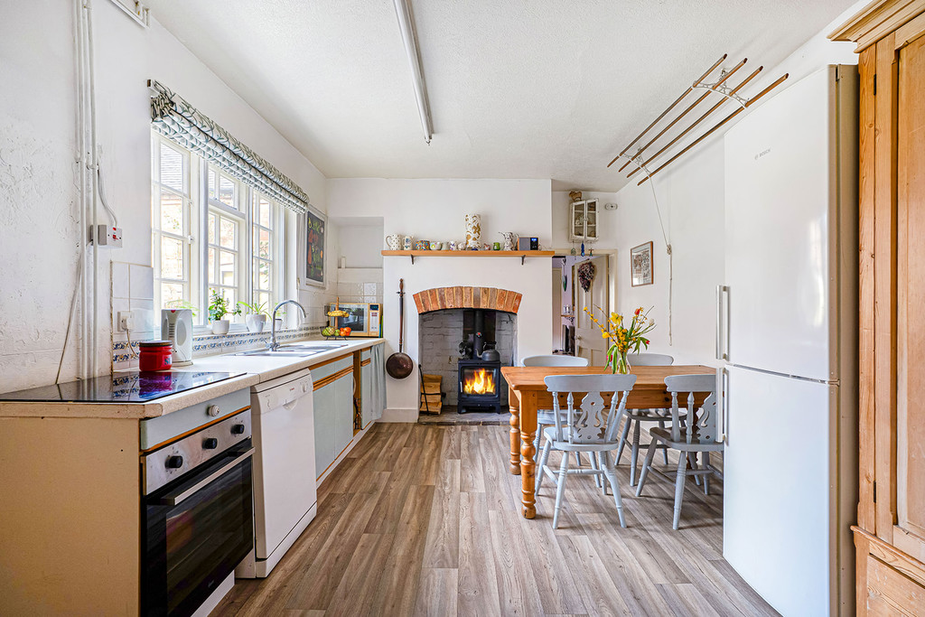Reception Hall with part-glazed front door, stone floor and built-in dresser unit with shelving and cupboards. Guest WC/Utility Room with tiled floor, close coupled WC, window to rear, Belfast sink with mixer tap and shower attachment, space and plumbing for washing machine and built-in floor to ceiling cupboards. Sitting Room outlook to the front of the building, fireplace with built-in furniture to chimney recesses either side. Kitchen Breakfast Room fitted with worktop to one wall, inset stainless steel 1½ bowl single drainer sink, space and plumbing for dishwasher, electric cooker with hob over. Solid fuel stove set to fireplace with brick hearth and outlook to the rear of the property. Living Room double aspect to rear of the property with under stairs cupboard and exposed beams to ceiling. Boot Room with windows to two sides, door to rear garden, electric light and power supply. Space and plumbing for washing machine. Cellar with stone steps leading from under stairs doorway, brick floor, electric light and power supply.