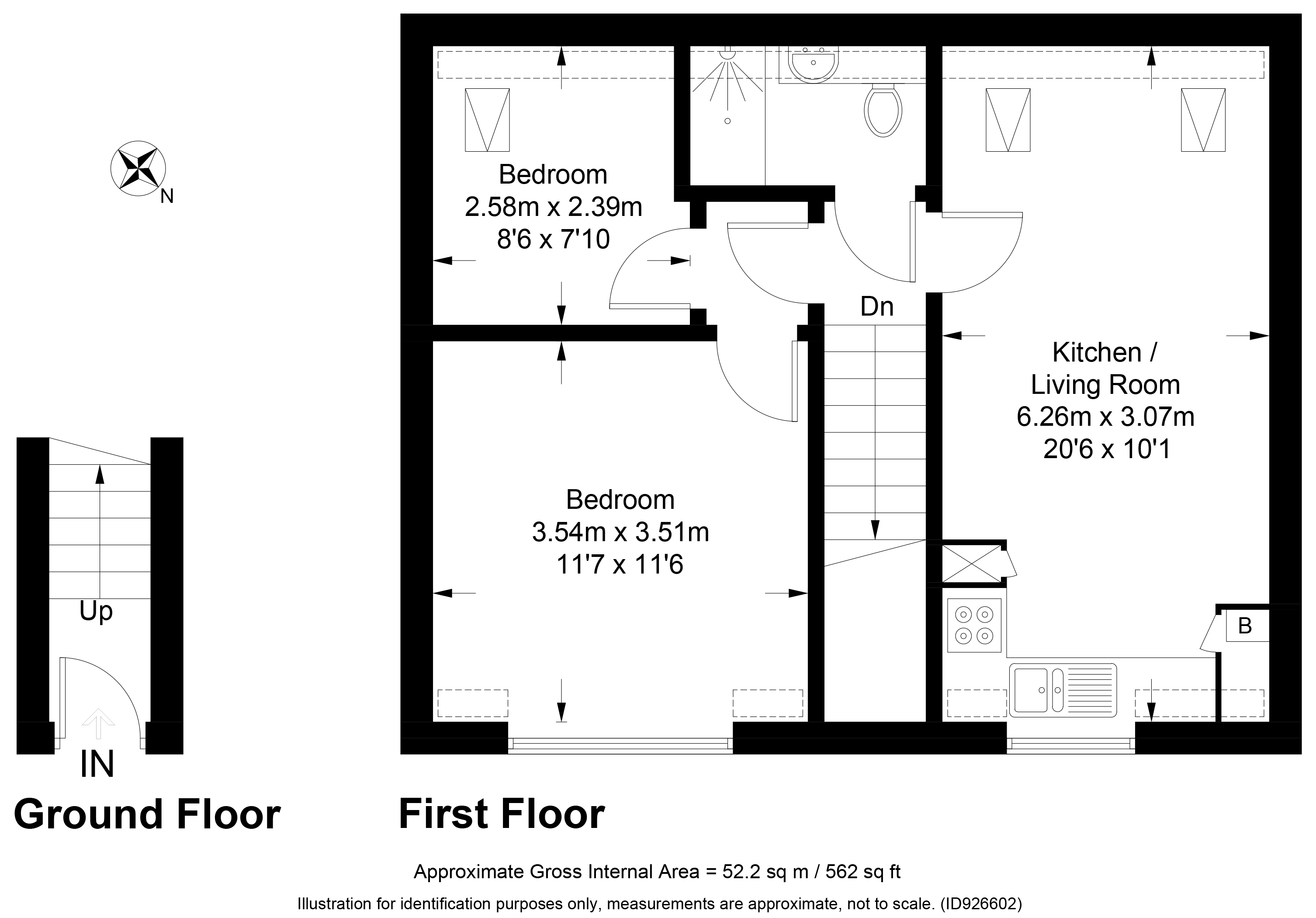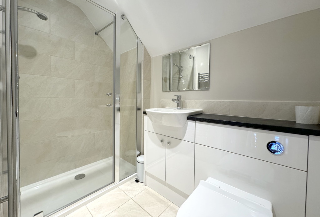Landing. Living Room/Kitchen double aspect with outlook to the front of the property and conservation light windows to the rear. Wood effect flooring and fitted with a range of kitchen units under wood effect worktops to three walls. Inset stainless steel 1½ bowl single drainer sink with mixer tap. Inset four ring gas hob with extractor hood over and single electric oven under. Built-in fridge and separate freezer. Integrated dishwasher and washing machine. Wall mounted Worcester gas fired boiler. Bedroom One outlook to the front of the property. Bedroom Two conservation light window to the rear. Shower Room fitted with double shower cubicle with glazed door and wash hand basin set to vanity unit with WC to side. Tiled floor, towel radiator and extractor fan.