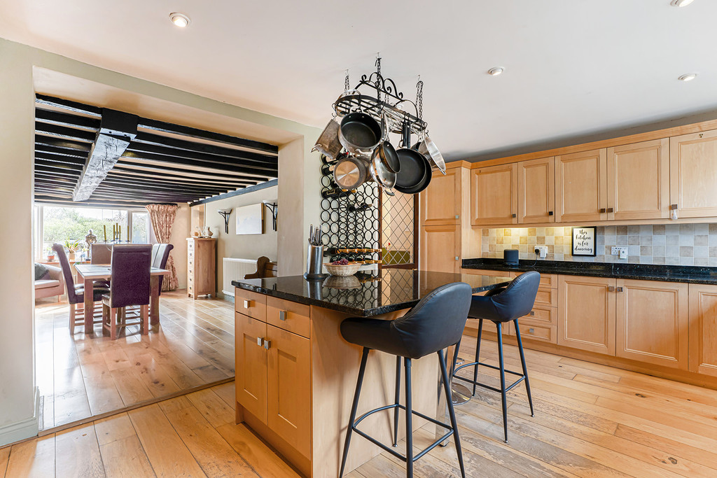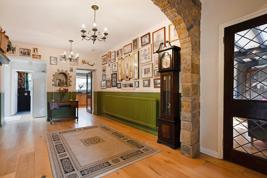 Entrance Porch double doors from the courtyard, with stained glass windows, quarry tile floor and door to Reception Hall range of built-in cupboards to one wall, glazed double doors to rear garden. Guest WC high-level WC, pedestal wash hand basin, obscured window and tiled floor. Sitting Room double aspect to front and rear including glazed door to garden. Stone fireplace with multi fuel stove. Storeroom quarry tile floor, window and shelving. Study walk-in bay window to front and fireplace with solid fuel stove. Dining Room outlook to the front of the property, ornamental stone fireplace, exposed beams to ceiling and built-in storage units with worktop, shelving and cupboard. Kitchen Breakfast Room fitted with a range of matching units under granite worktops to three walls. Breakfast bar and worktop to centre of the room. Inset sink and drainer, integrated dishwasher and fridge freezer. Rangemaster cooker with matching extractor over. Outlook to the rear of the property.